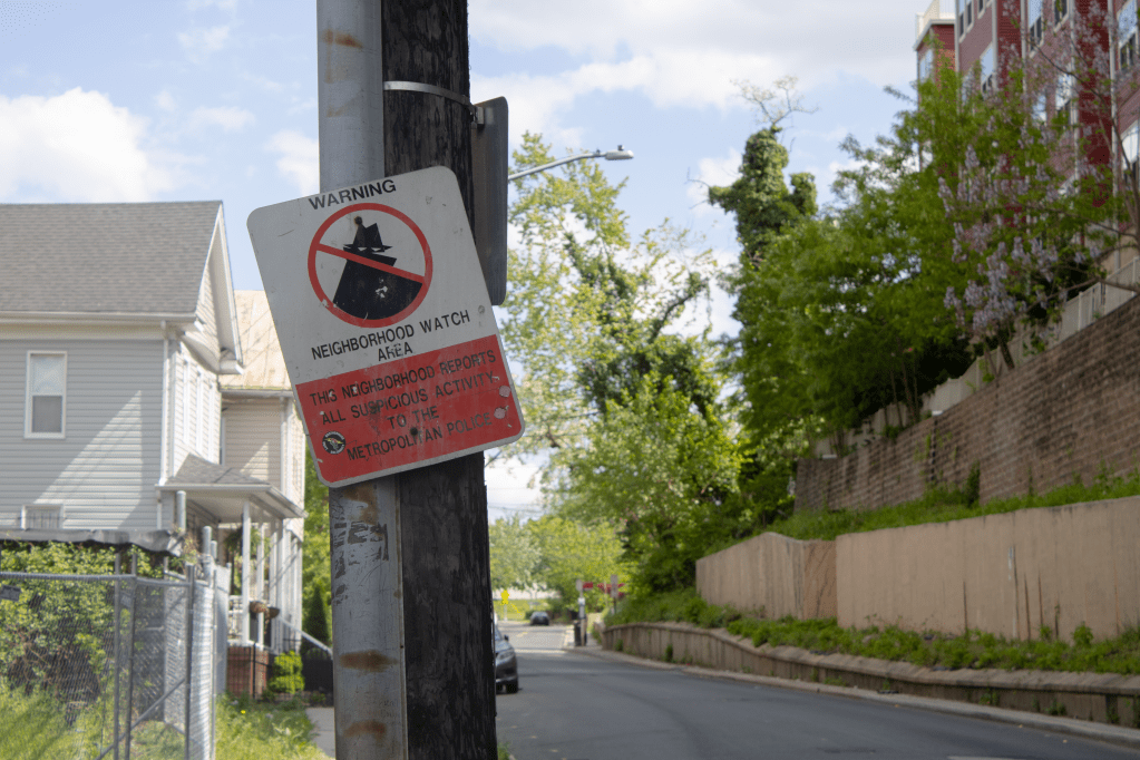 Old, worn signs are tired of reminding people that they should report crime and keep a watchful eye. The street is as it always has been.